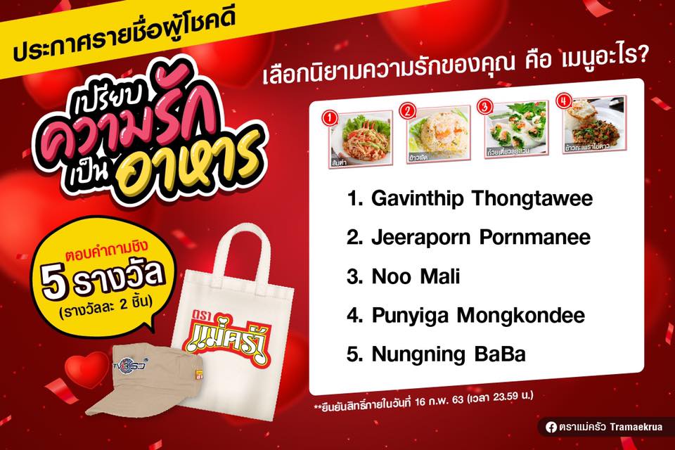 ประกาศผลรายชื่อผู้โชคดี ในกิจกรรม “เปรียบความรักเป็นอาหาร เลือกนิยามความรักของคุณ คือ เมนูอะไร” ??