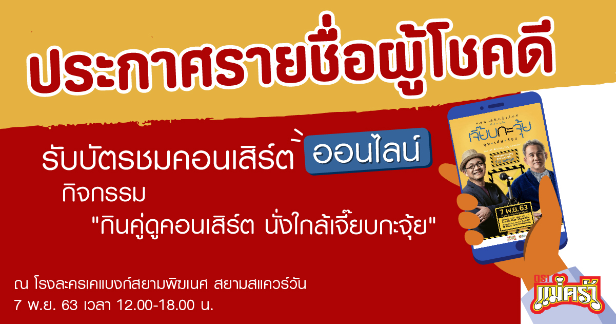 ผู้โชคดีในกิจกรรม “กินคู่ดูคอนเสิร์ต นั่งใกล้เจี๊ยบกะจุ้ย” รับสิทธิ์ชมคอนเสิร์ต ออนไลน์ ผ่านช่องทางการไลฟ์สด !!