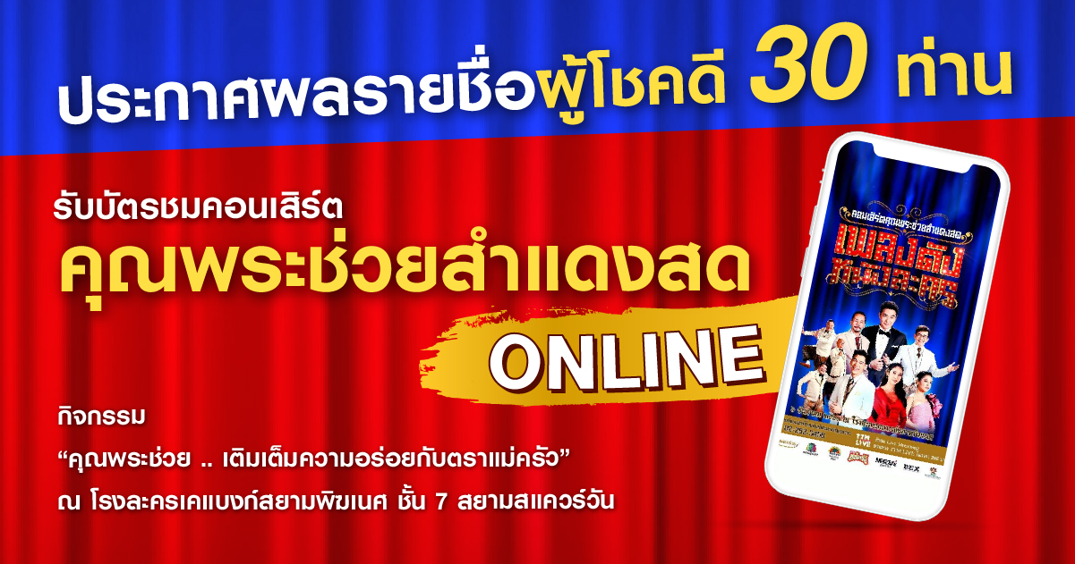 ** ผู้โชคดีรับสิทธิ์ชมคอนเสิร์ตออนไลน์คุณพระช่วยสำแดงสด เพลงดังหนังละคร จำนวน 30 รางวัล รางวัลละ 1 สิทธิ์