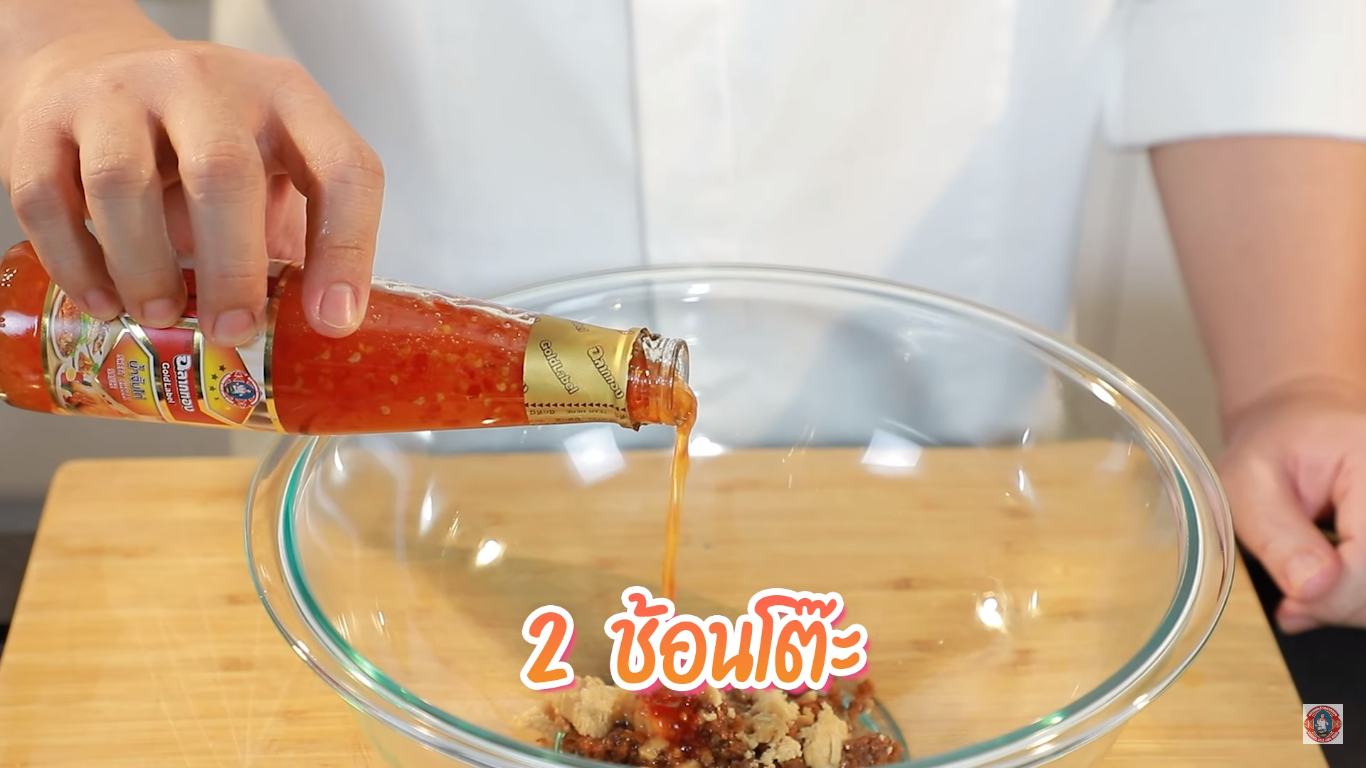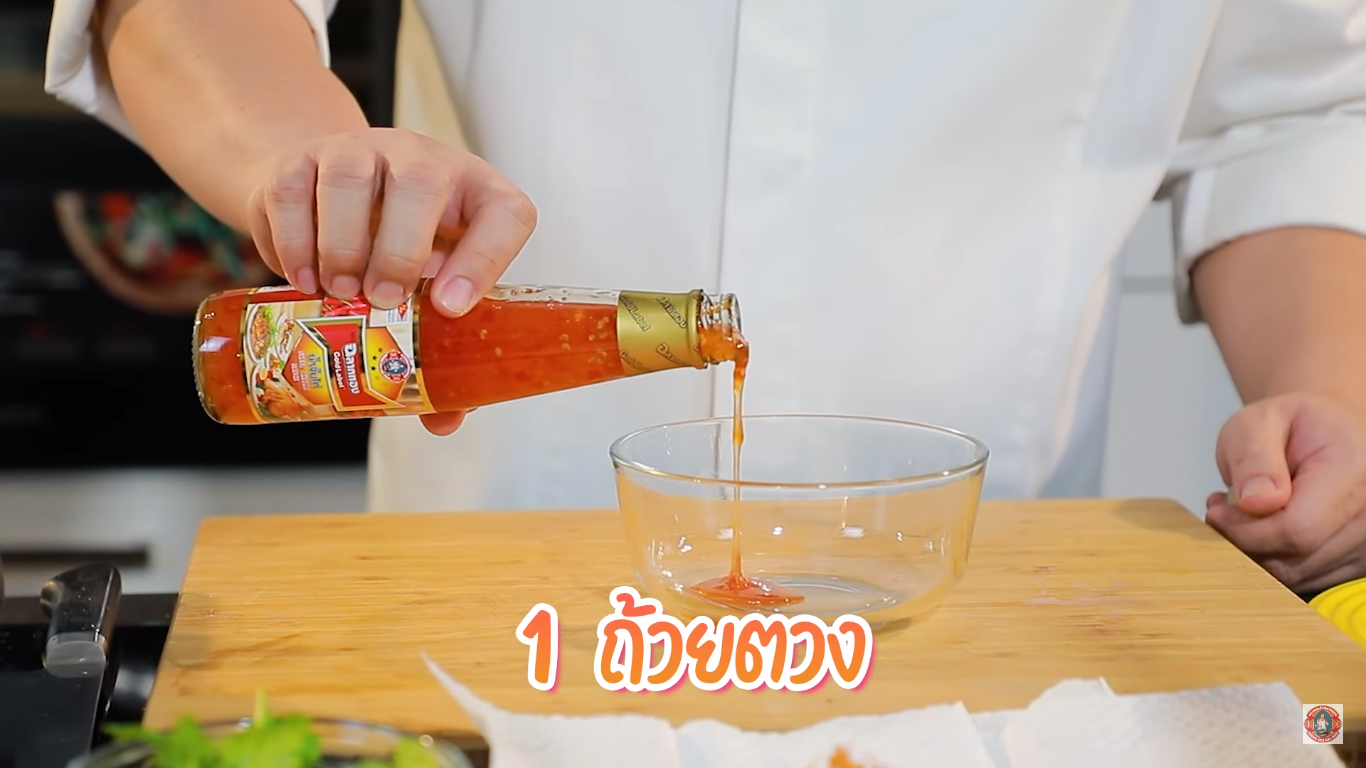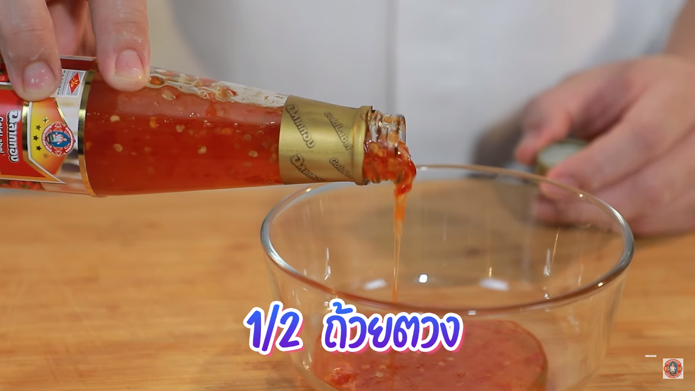 2. ทำในส่วนของซอสเดือด ใส่น้ำจิ้มไก่ ตราฉลากทอง ลงในถ้วย
