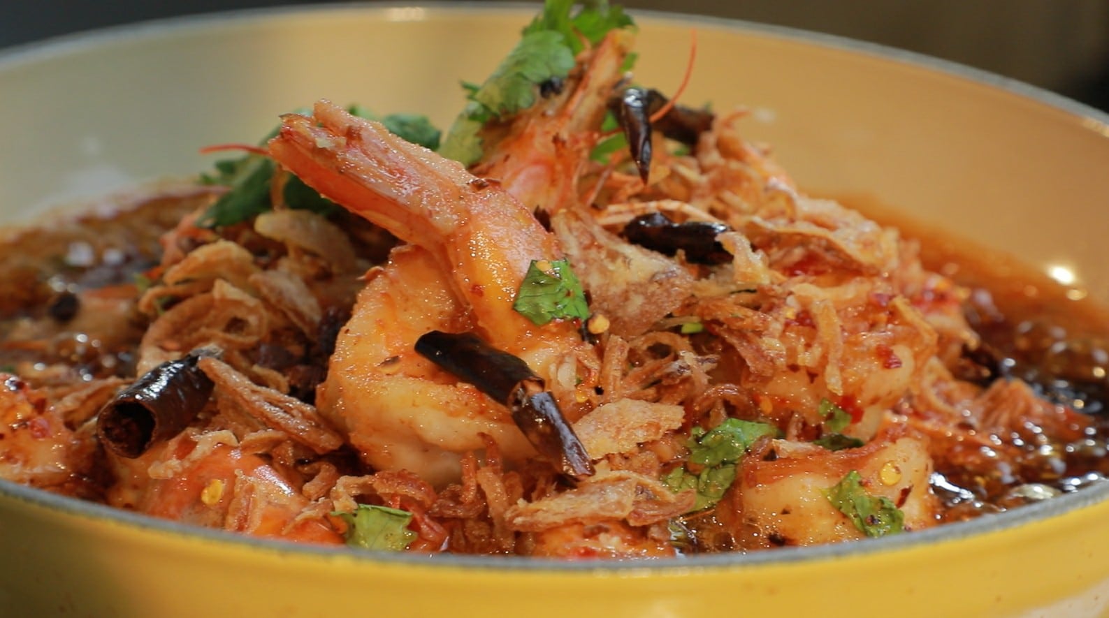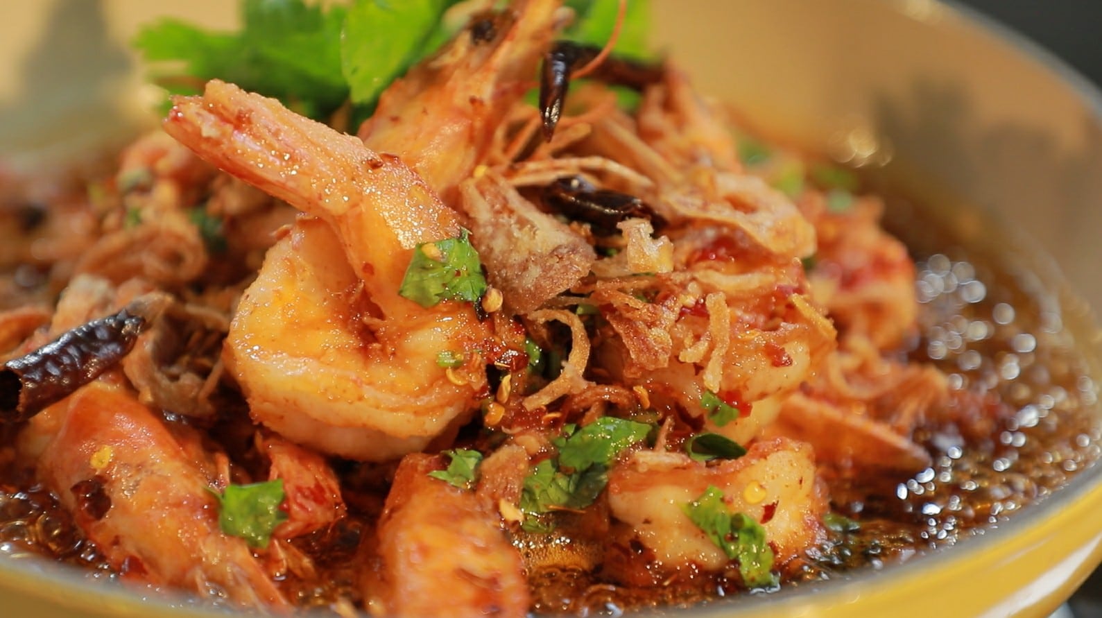 ตามด้วยซอสเดือด และหอมเจียว และตกแต่งด้วยผักชี เสร็จพร้อมเสิร์ฟ