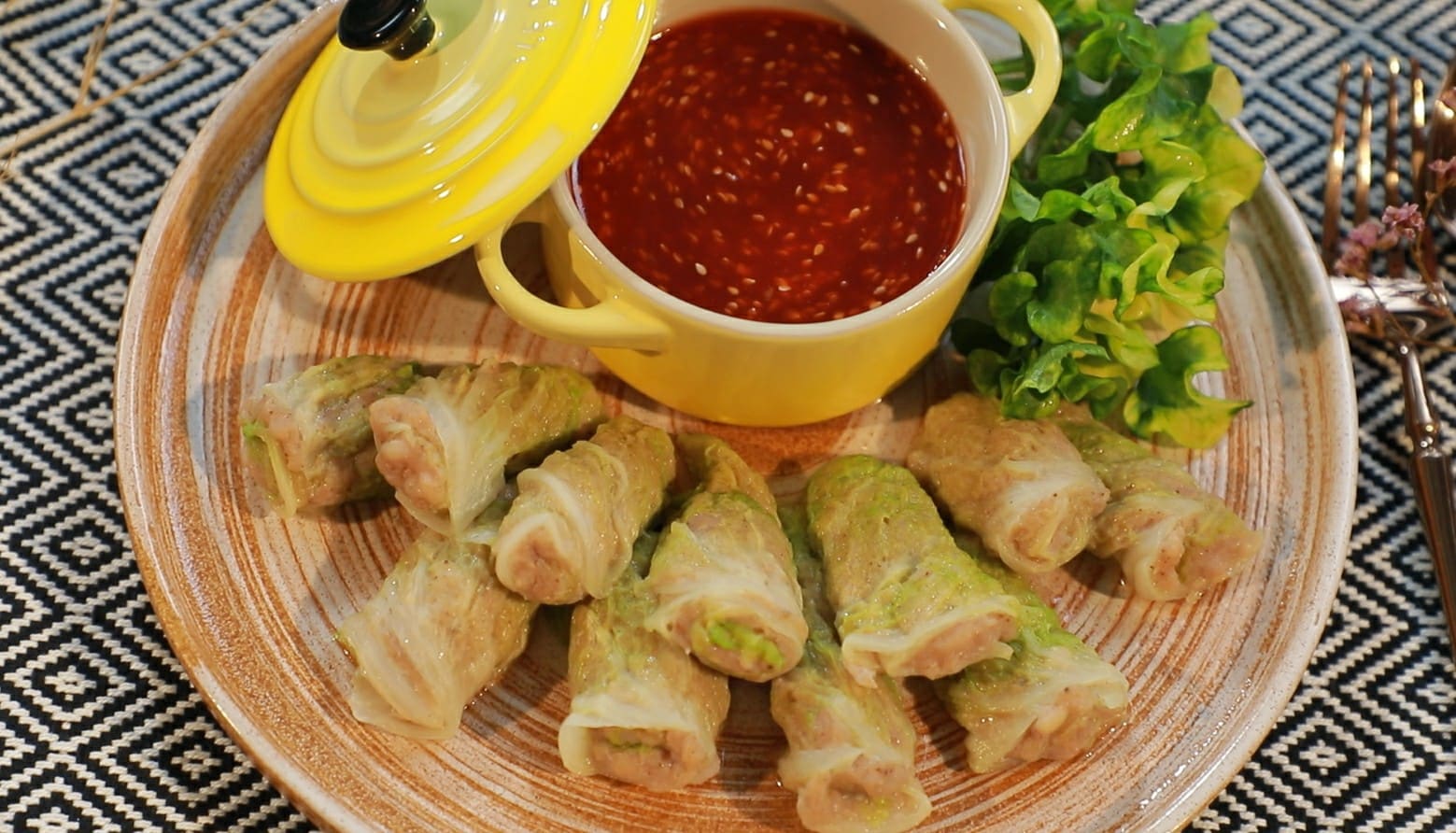 มาต่อที่เมนู “ซ่อนหมูเด้ง” จะใช้ผัดกาดขาวพันหมูเด้ง และนำไปนึ่ง เป็นเมนูที่ทำง่ายมาก โดยเมนูนี้ถ้ากินคู่กับน้ำจิ้มไก่ ตราฉลากทอง ผสมกับซอสมะเขือเทศ จะอร่อยมากเลยค่ะ และต้องอย่าลืม เพิ่มงาขาวคั่วเพื่อเพิ่มความหอมด้วยนะ จากนั้นเพิ่มความกรุบกรอบอีกนิด โดยกินคู่กับเกี๊ยวแห้งค่ะ ติดตามความอร่อยได้ที่ 31 สิงหาคม 2565