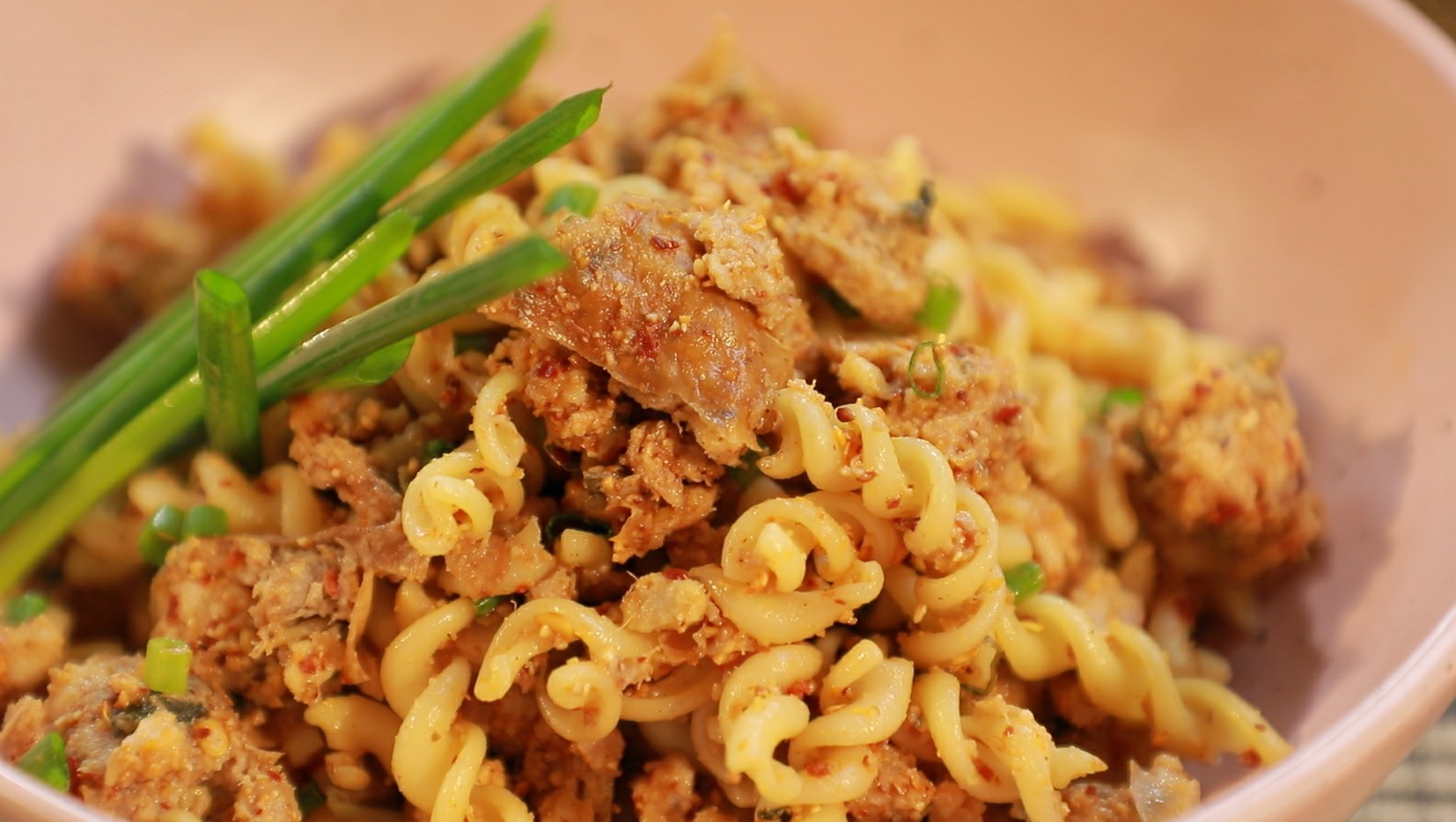 2.ขยำไส้อั่วลงไป ตามด้วยข้าวคั่ว และเส้นพาสต้าฟูซีลี ใส่หอมซอย